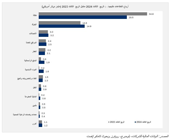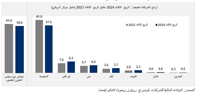 وحسب تقرير وحدة البحوث والاستراتيجيات الاستثمارية بشركة كامكو للاستثمار، اليوم الأربعاء، فقد تراجعت أرباح الشركات المدرجة ببورصات الخليج في الربع الثالث من العام الحالي 3.3% سنوياً عند 59.6 مليار دولار، مقابل 61.6 مليار دولار لذات الفترة من 2023.
