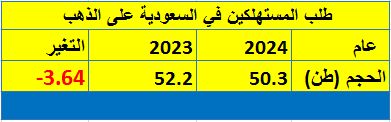 وبلغ إجمالي الطلب على الذهب في المملكة من المستهلكين (المجوهرات والسبائك) 50.3 طن في عام 2024، مقابل 52.2 طن في العام 2023.
