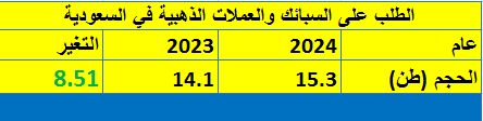 وبلغ إجمالي الطلب بالسعودية على السبائك والعملات المعدنية الذهبية 15.4 طن في عام 2024، وهو أعلى مستوى في آخر 10 سنوات، منذ أن ارتفع إلى 15.6 طن في عام 2014م.