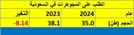 وبلغ إجمالي الطلب على المجوهرات في المملكة نحو 35 طناً في العام 2024، مقارنة مع 38.1 طن في عام 2023، فيما كان يبلغ 37.9 طن في 2022 و33.3 طن في عام 2021م.