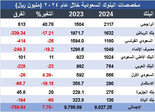 مخصصات البنوك السعودية تتراجع إلى 9.03 مليار ريال خلال العام 2024