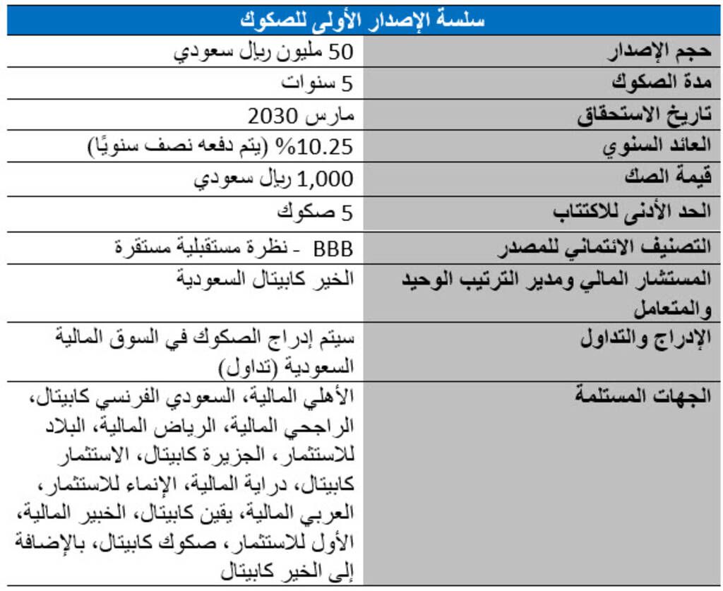 وقد باشرت الشركة بإصدار السلسلة الأولى بقيمة 50 مليون ريال سعودي من برنامج الصكوك، وابتدأ الاكتتاب بالصكوك المطروحة ضمن السلسلة الأولى يوم الأحد 16 فبراير 2025 ويستمر لغاية يوم الخميس القادم 27 فبراير 2025.