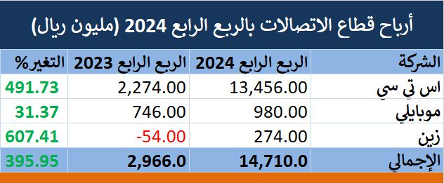 وعلى صعيد نتائج قطاع الاتصالات بالربع الرابع من 2024، قفزت الأرباح المجمعة إلى 14.71 مليار ريال، مقابل أرباح بلغت 2.97 مليار ريال بالربع الرابع من عام 2023، بارتفاع نسبته 396%.