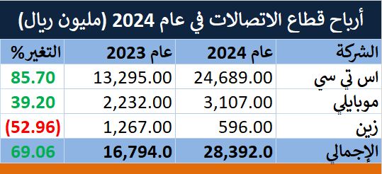 واحتلت الاتصالات السعودية "اس تي سي" موقع الصدارة بلا منازع، لتقتنص الشركة نحو 87% من إجمالي أرباح القطاع، بالعام 2024، وتدعم نمو الأرباح الإجمالية للقطاع.