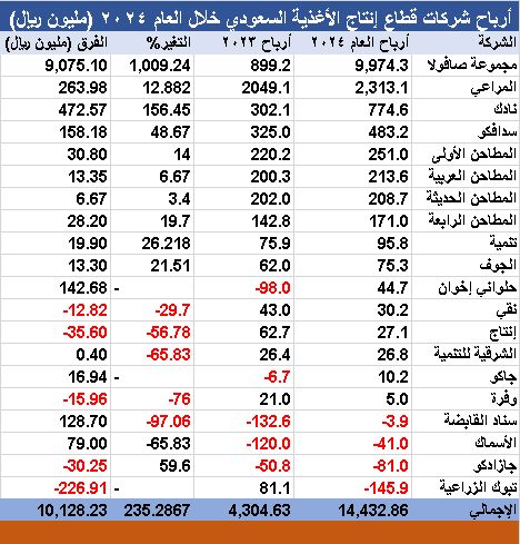 وبحسب إحصائية لـ"مباشر" تستند إلى إفصاحات الشركات على موقع "تداول"، بلغت الأرباح المجمعة لشركات المُدرجة بقطاع إنتاج الأغذية نحو 14.43 مليار ريال خلال العام 2024، مقابل 4.30 مليار ريال في عام 2023، وبفارق يعادل 10.13 مليار ريال.