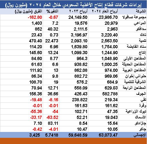 وتصدرت الإيرادات مجموعة صافولا بنحو 23.98 مليار ريال، مقابل 24.15 مليار ريال في عام 2023، حيث تراجعت بنحو 0.67%، وتلاها "المراعي" بإيرادات بلغت 20.98 مليار ريال، مقارنة بـ19.57 مليار ريال في عام 2023 ، بما يعادل 1.40 مليار ريال.