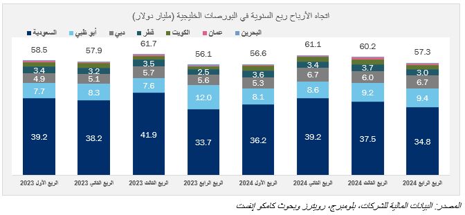 الشركات المدرجة ببورصات الخليج تُسجل ربحاً فصلياً بـ57.3 مليار دولار