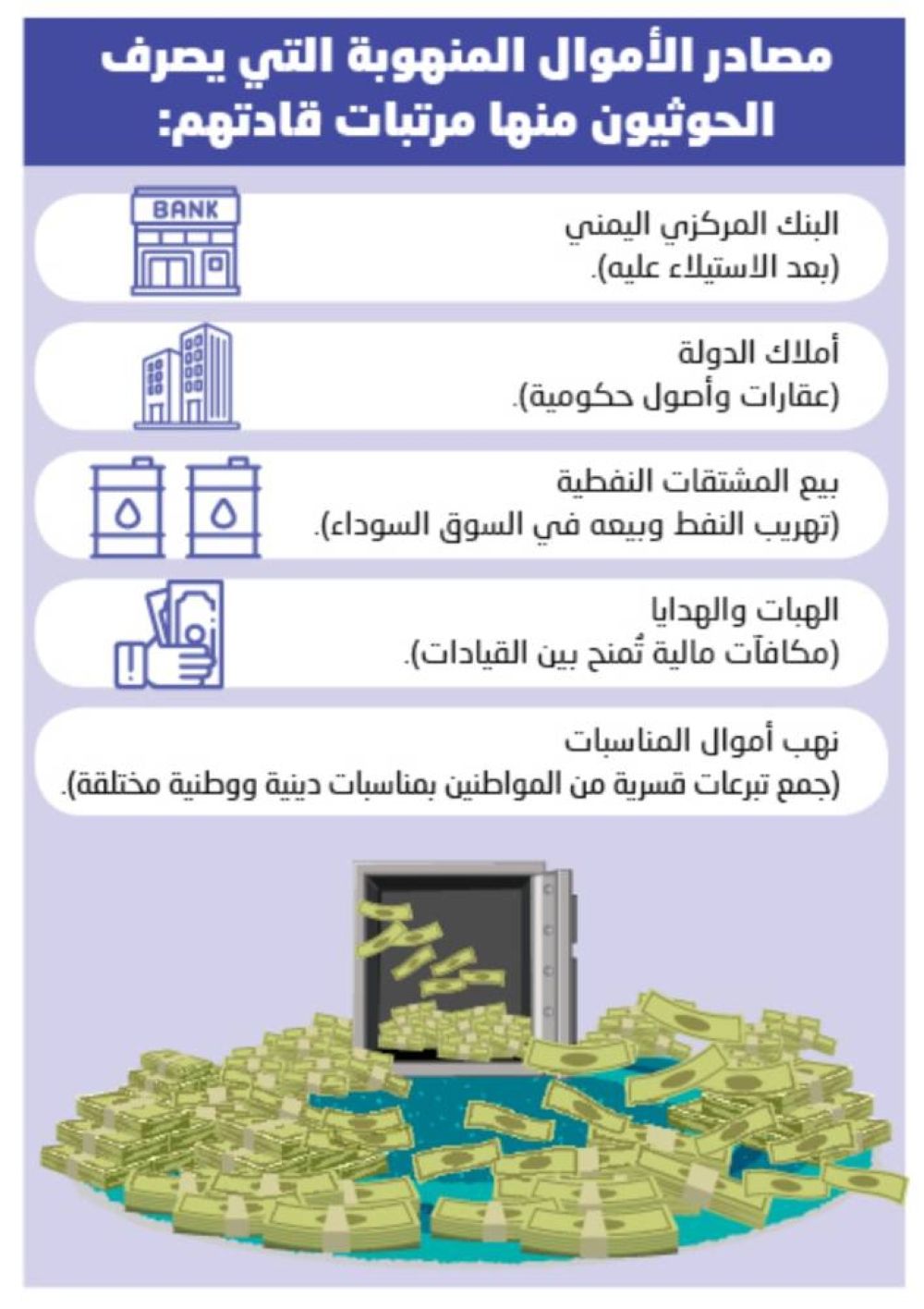 مصادر الأموال المنهوبة التي يصرف الحوثيون منها مرتبات قادتهم:
