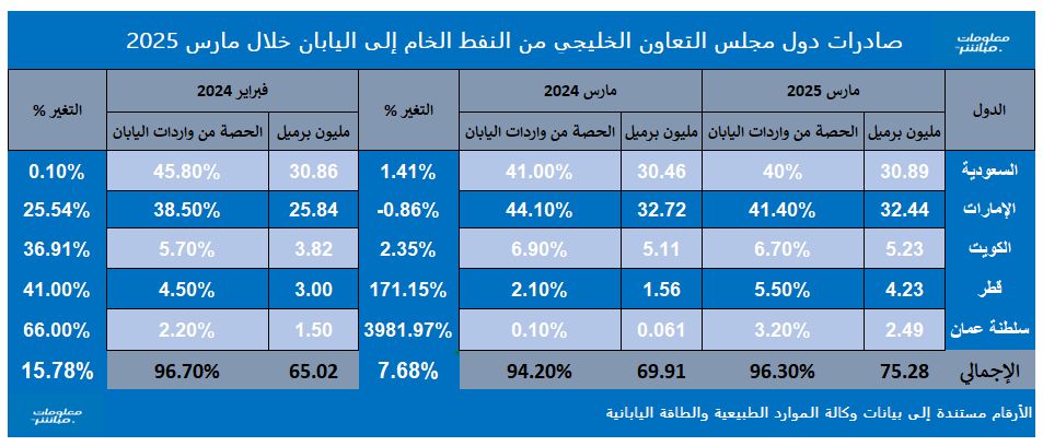 شكلت صادرات النفط الخليجي أكثر من 96.18% من واردات اليابان في شهر مارس/آذار 2025 ككل البالغة 78.27 مليون برميل.