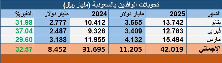 تحويلات الوافدين بالسعودية ترتفع 32.6% بالربع الأول.. ومارس يسجل مستوى تاريخياً