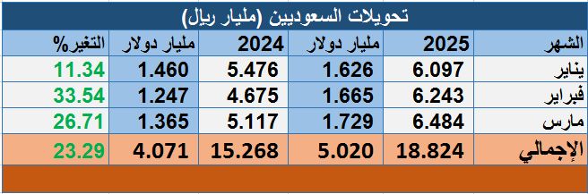 وارتفعت تحويلات السعوديين إلى 6.48 مليار ريال (1.73 مليار دولار) وذلك خلال شهر مارس/ آذار الماضي، مقابل 5.12 مليار ريال (1.37 مليار دولار) في الشهر ذاته من عام 2024م.