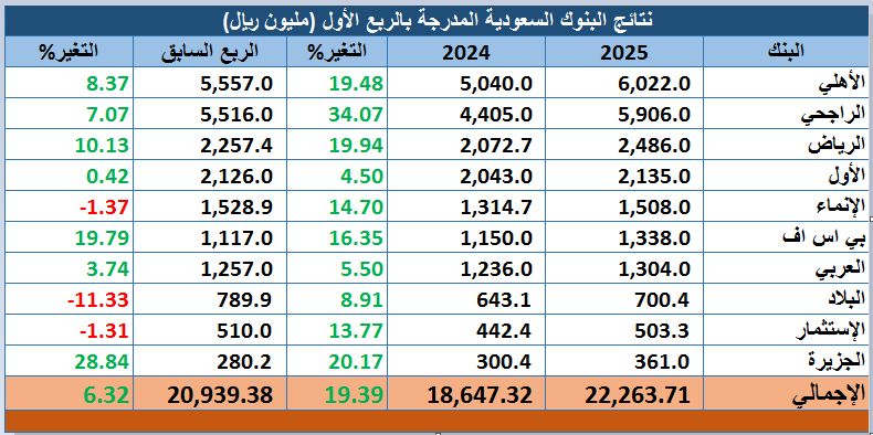 بنمو 19%.. البنوك السعودية المدرجة تسجل أرباح قياسية خلال الربع الأول من 2025