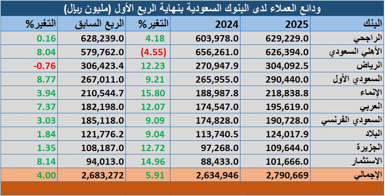 وبلغت قيمة ودائع العملاء لدى البنوك المدرجة في السوق المالية السعودية 2.79 تريليون ريال بنهاية الربع الأول من العام 2025م، مقابل 2.63 تريليون ريال بنهاية الربع الأول من العام 2024م.
