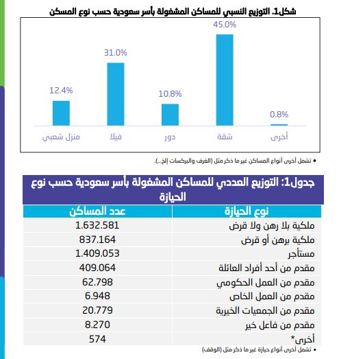 وكانت نسبة المساكن المشغولة بأسر سعودية من النوع شقة الأعلى بواقع 45% من إجمالي المساكن المشغولة بأسر سعودية، تليها الفلل بنسبة 31%.