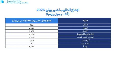 وفي ضوء الآفاق المستقبلية المستقرة للاقتصاد العالمي وأسس السوق الإيجابية الحالية، كما يتضح من انخفاض المخزونات البترولية، وبناء على ما تم الاتفاق عليه في اجتماع 5 ديسمبر 2024م بشأن الاستعادة التدريجية والمرنة لتعديلات الإنتاج التطوعية البالغة (2.2) مليون برميل يوميًا اعتبارًا من 1 أبريل 2025م، قررت الدول المشاركة تنفيذ تعديل في الإنتاج قدره (411) ألف برميل يوميًا في شهر يوليو 2025م مقارنة بمستوى الإنتاج المطلوب في يونيو 2025م، وهو ما يعادل ثلاث زيادات شهرية، كما هو موضح في الجدول المرفق.