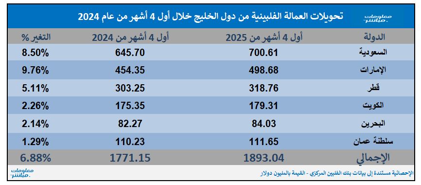 ووفق إحصائية "معلومات مباشر" فقد بلغت قيمة تحويلات العمالة الفلبينية من دول الخليج الست في الأربعة أشهر المنتهية بختام أبريل/السابق نحو 1.89 مليار دولار، فيما بلغت تحويلات تلك العمالة من منطقة الشرق الأوسط خلال الفترة المذكورة 1.97 مليار دولار.