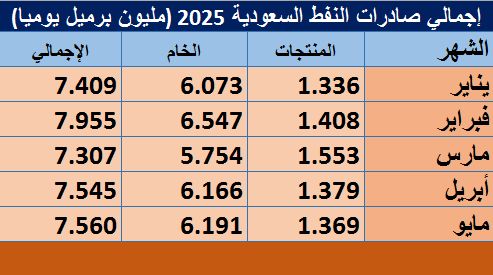 وبلغت صادرات المملكة من النفط الخام 6.191 مليون برميل يوميا في شهر مايو/ أيار 2025م، مقارنة مع صادرات بلغت 6.166 مليون برميل يوميا في أبريل/ نيسان الماضي.