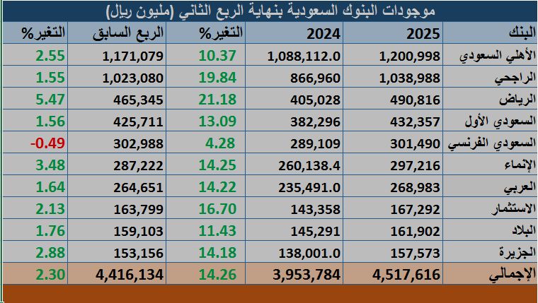 ووصل إجمالي الأصول/ موجودات البنوك في المملكة إلى 4.517 تريليون ريال (1.205 تريليون دولار) بنهاية الربع الثاني من عام 2025م، مقابل 3.954 تريليون ريال (1.054 تريليون دولار) بنهاية الربع ذاته من عام 2024م.