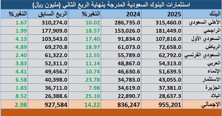 استثمارات البنوك السعودية تتجاوز 955 مليار ريال بنهاية الربع الثاني من 2025