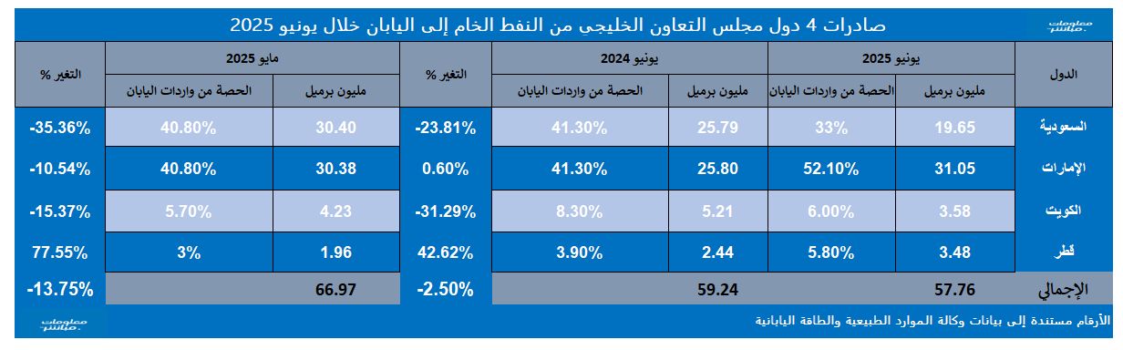 كما تراجع حجم صادرات دول الخليج الأربع النفطية إلى اليابان بنحو 13.75% عن حجمها في شهر مايو/أيَّار 2025 البالغ 66.97 مليون برميل.