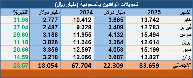 وارتفعت تحويلات الوافدين؛ وفقاً لإحصائية أعدها "مباشر" تستند لبيانات البنك المركزي السعودي "ساما"، إلى 83.66 مليار ريال (22.3 مليار دولار) في أول 6 أشهر من العام 2025م، مقابل 67.7 مليار ريال (18.05 مليار دولار) في الفترة ذاتها من عام 2024م.