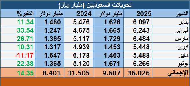 وشهدت تحويلات السعوديين ارتفاعا خلال شهر يونيو/ حزيران الماضي بنسبة 22.4% على أساس سنوي، إلى 6.27 مليار ريال (1.67 مليار دولار)، مقابل 5.12 مليار ريال (1.37 مليار دولار) في الشهر ذاته من عام 2024م.