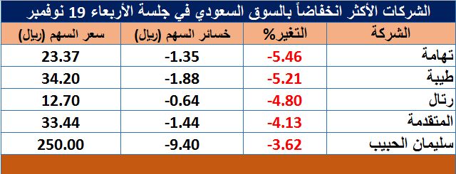 وسجلت 168 شركة خسائر بتعاملات الأربعاء، مقابل ارتفاع أسهم 80 شركة، علما بأن السوق الرئيسي لتداول السعودية يضم 262 شركة.