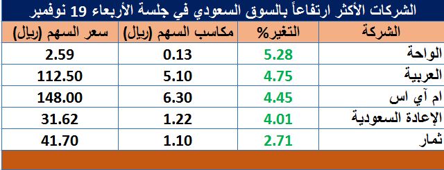 وفي المقابل، تصدر سهم "الواحة" مكاسب الأسهم بتعاملات اليوم؛ حيث أغلق على ارتفاع نسبته 5.28%، ليزيد سعر السهم بواقع 0.13 ريال ويغلق عند مستوى 2.59 ريال.