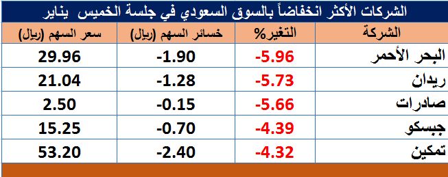 فيما تصدر سهم "البحر الأحمر" الأسهم الأكثر انخفاضا بنسبة 5.96%، لينهي تعاملات الخميس بمستوى 29.96 ريال.