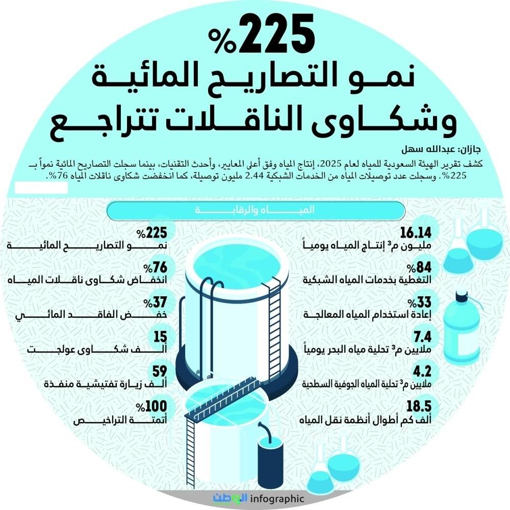 كشف تقرير الهيئة السعودية للمياه لعام 2025، إنتاج المياه وفق أعلى المعايير، وأحدث التقنيات، لضمان توفيرها بكفاءة عالية، وسجلت سعة الإنتاج اليومي للمياه 16.14 مليون م³، و7.442 مليون م³ يوميا تحلية مياه البحر، و4.256 مليون م³ يوميا تحلية المياه الجوفية والسطحية، و4.446 مليون م³ يوميا تحلية مياه البحر للقطاع الخاص، إلى جانب العمل على زيادة السعات الإنتاجية بمشاريع نوعية لمختلف مناطق المملكة، وسجلت سعات أنظمة النقل على مستوى المملكة 17.2 مليون م³ يوميا، وبلغ مجموع أطوال أنظمة نقل المياه في المملكة 18.5 ألف كم.