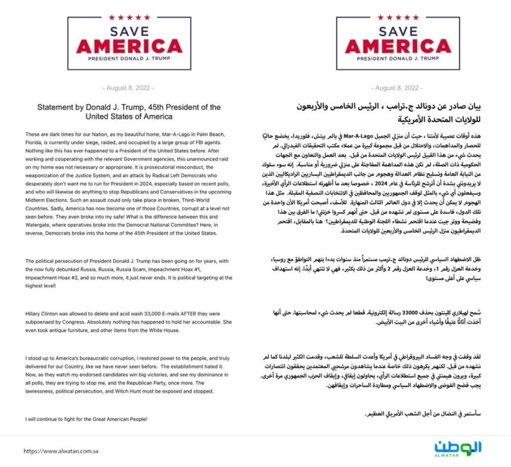 هذه أوقات عصيبة لأمتنا ، حيث أن منزلي الجميل Mar-A-Lago في بالم بيتش، فلوريدا، يخضع حاليًا للحصار والمداهمات، والاحتلال من قبل مجموعة كبيرة من عملاء مكتب التحقيقات الفيدرالي.