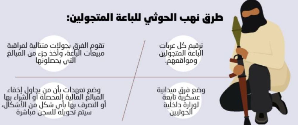وبين المصدر أن كثيرا من الباعة أفادوا بأنه يتم عند الغروب، قدوم بعض من الحوثيين لأخذ كل المبالغ، وأنه لا يمكن إخفاء المبلغ المحصل بأي شكل من الأشكال، حيث تم مع بدء ترقيم المواقع وضع تعهدات بأن من يحاول إخفاء المبالغ المالية المحصلة، أو الشراء بها أو التصرف بها بأي شكل من الأشكال، سيتم تحويله للسجن مباشرة.