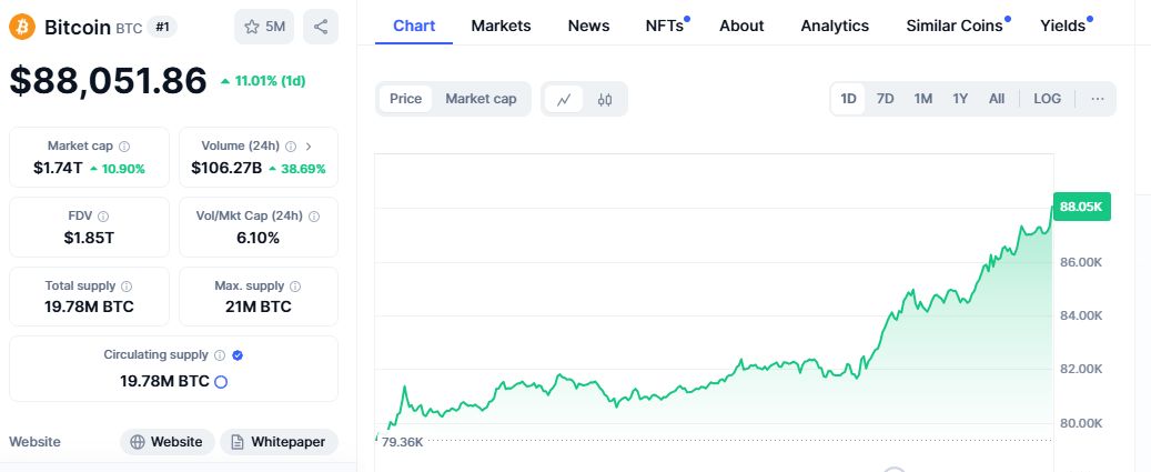 وبحلول الساعة 9:26 مساء بتوقيت جرينتش زاد سعر عملة البتكوين، بأكثر من 11% لتسجل مستوى 88051 دولاراً.
