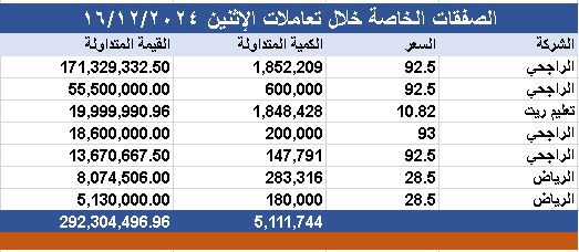 وتم تنفيذ 4 صفقات خاصة على "الراجحي" بنحو 259.10 مليون ريال، من خلال 2.8 مليون سهم عند سعر 92.5 ريال و 93 ريال.