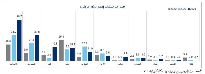 وسجل المغرب أكبر انخفاض، إذ تراجعت إصداراته إلى 11 مليار دولار مقابل 17.1 مليار دولار في 2023، بانخفاض قدره 6.2 مليار دولا، في المقابل، تصدرت الإمارات المشهد بزيادة ملحوظة في إصداراتها التي بلغت 49.7 مليار دولار في عام 2024 مقابل 31.2 مليار دولار في عام 2023.