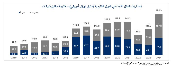 وتفوقت إصدارات الشركات على الإصدارات الحكومية للمرة الأولى منذ أكثر من 6 أعوام، إذ وصلت إلى 72.2 مليار دولار في العام 2024، مقابل 40.7 مليار دولار في العام 2023، بما يمثل نمواً قوياً بنسبة 77.4 %.