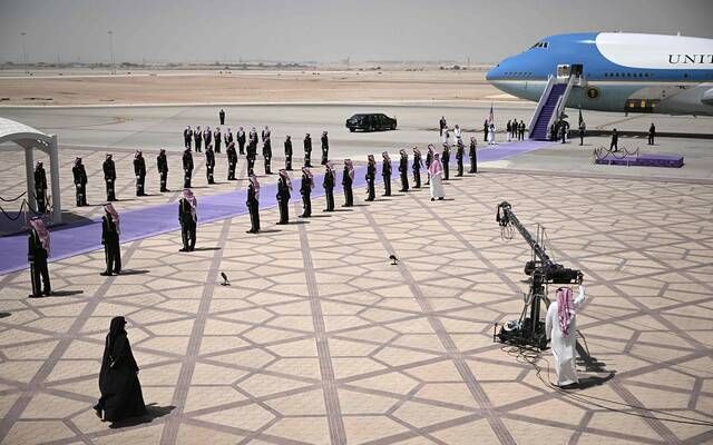 وكان في استقبال الرئيس الأمريكي لدى وصوله إلى مطار الملك خالد الدولي بالرياض؛ ولي العهد رئيس مجلس الوزراء، الأمير محمد بن سلمان بن عبدالعزيز آل سعود.