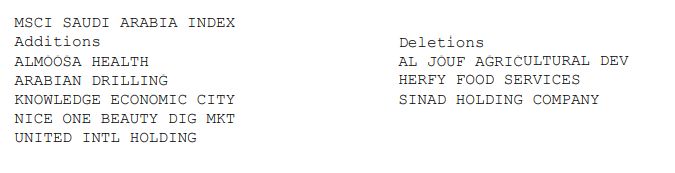 وبالنسبة لمؤشر MSCI العالمي للشركات الصغيرة، سيشهد إضافة 5 شركات سعودية مقابل استبعاد أسهم 3 شركات أخرى، حيث سيتم إضافة أسهم شركات: الموسى الصحية، والحفر العربية، ومدينة المعرفة الاقتصادية، ونايس ون بيوتي للتسويق الإلكتروني، بالإضافة إلى الشركة المتحدة الدولية القابضة، فيما سيتم استبعاد أسهم شركات: سناد القابضة، والجوف للتنمية الزراعية، وهرفي للخدمات الغذائية.