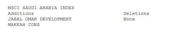 وكشفت MSCI، في مراجعتها الدورية، أن مؤشر MSCI القياسي العالمي سيشهد إضافة 30 سهما مقابل حذف 61 سهما ضمن مراجعة شهر مايو/ أيار الحالي، حيث سيشهد مؤشر MSCI بالسعودية إضافة شركتين لمؤشر MSCI القياسي العالمي؛ وهما شركة جبل عمر للتطوير، وشركة مكة للإنشاء والتعمير.