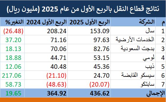أرباح قطاع النقل السعودي ترتفع إلى 436 مليون ريال بالربع الأول من 2025