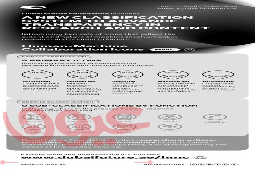 وتعمل الأيقونات التصنيفية، التي طوّرتها مؤسسة دبي للمستقبل، على قياس مستوى التعاون بين الإنسان والآلة (Human-Machine collaboration - HMC) ، وتوفر معيارًا عالميًا جديدًا للشفافية، يحدد بوضوح مدى تعاون البشر والذكاء الاصطناعي طوال عملية الإنتاج. تجدر الإشارة إلى أن هذا التصنيف متاح للاستخدام مجاناً، ومحمي بحقوق الطبع والنشر لضمان الاتساق، ومتوفر بشكل مفتوح للجميع من الباحثين والناشرين وصنّاع المحتوى حول العالم.