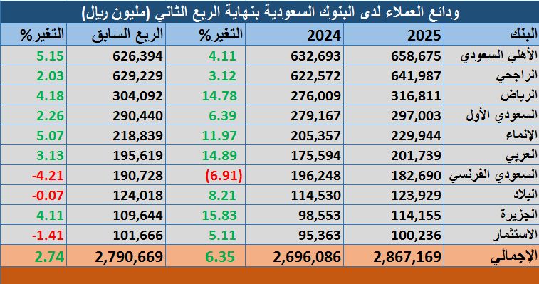 وبلغت قيمة ودائع العملاء لدى البنوك المدرجة في السوق المالية السعودية 2.87 تريليون ريال بنهاية الربع الثاني من العام 2025م، مقابل 2.7 تريليون ريال بنهاية الربع المقارن من العام 2024م.