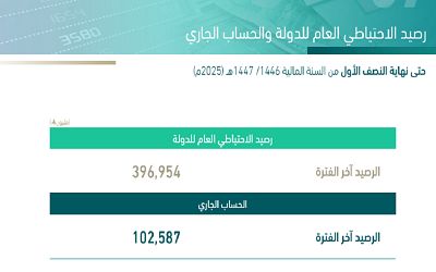 وبحسب التقرير بلغ رصيد الاحتياطي العام للدولة حتى نهاية النصف الأول من 2025 نحو 396.954 مليار ريال.