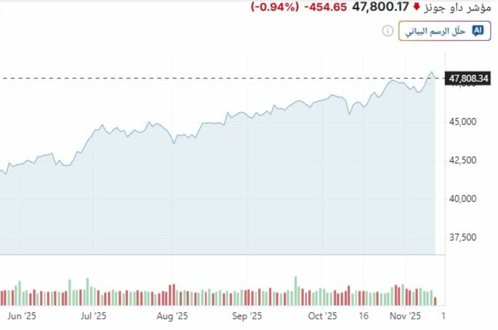 انخفض مؤشر "داو جونز" الصناعي بنسبة 0.20%، بما يعادل 84 نقطة، ليصل إلى مستوى 48,170 نقطة، بعد أن كان قد سجل أمس مستوى قياسيًا تجاوز 48 ألف نقطة لأول مرة.